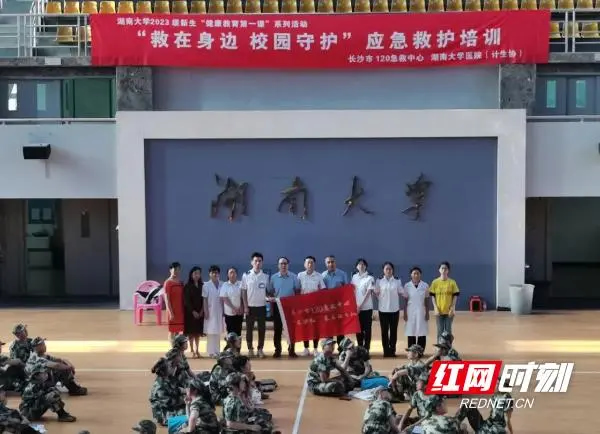 培训现场。红网时刻新闻9月6日讯(通讯员 伍柏玉)为提高大学生应急救护能力,巩固校园安全屏障,推进爱国卫生运动融入高校,开学之际,长沙市120急救中心应邀走进湖南大学开展“开学第一课”活动,分批次覆盖5739名大一新生培训急救知识与技能。